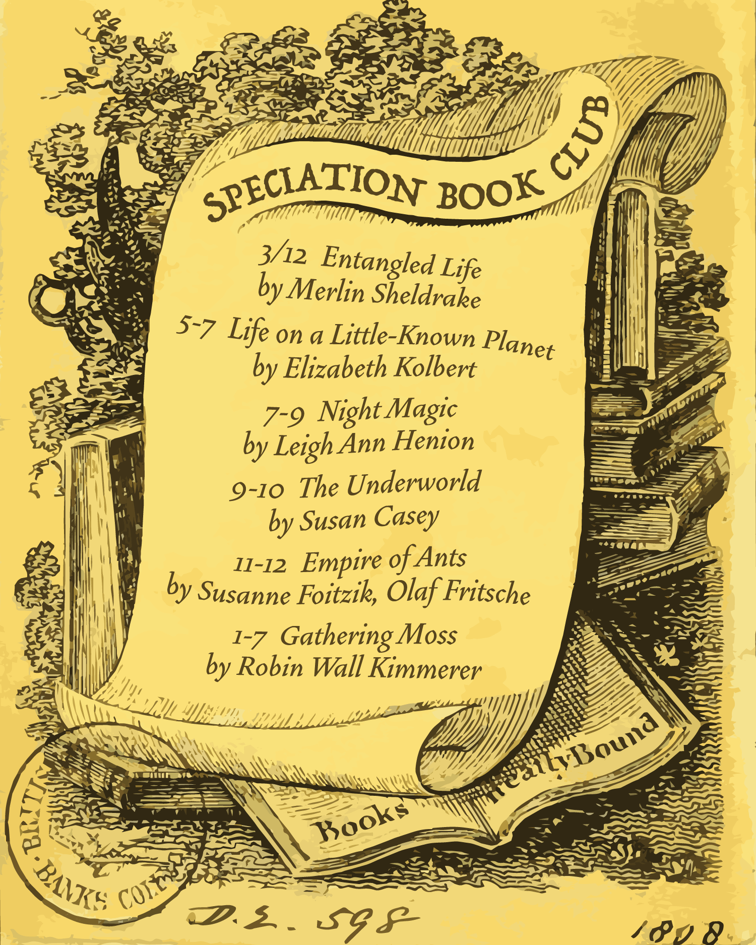 That’s right, Speciation has a book club! We read Nature nonfiction books, and have a casual discussion for about an hour. We meet every 2 months to give you plenty of time to read the book, and generally we pick books around 300 pages long.